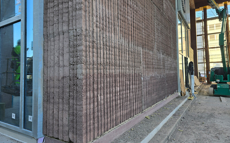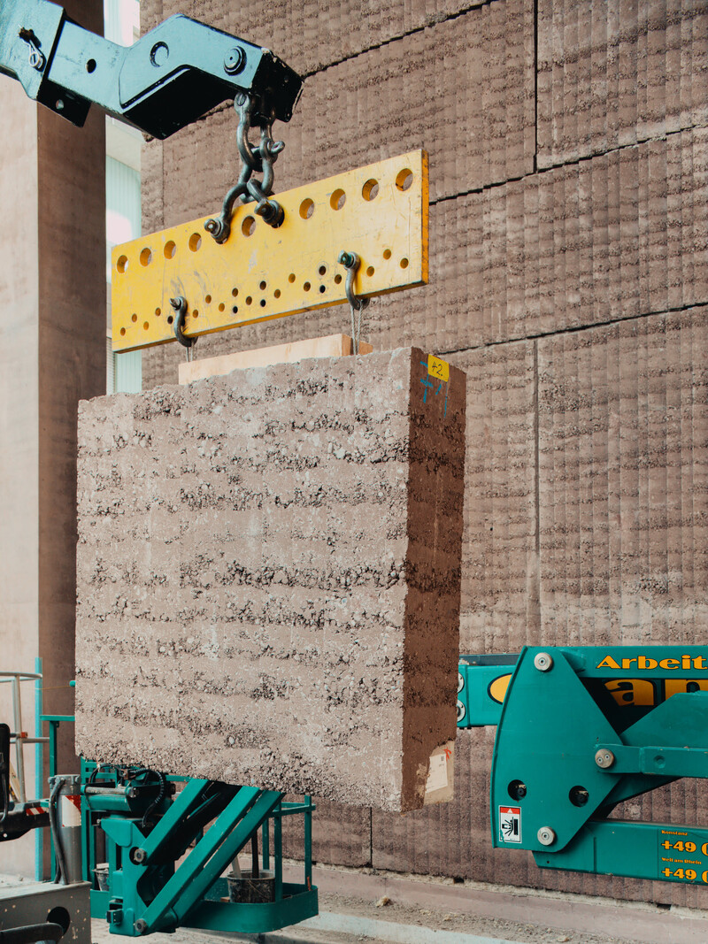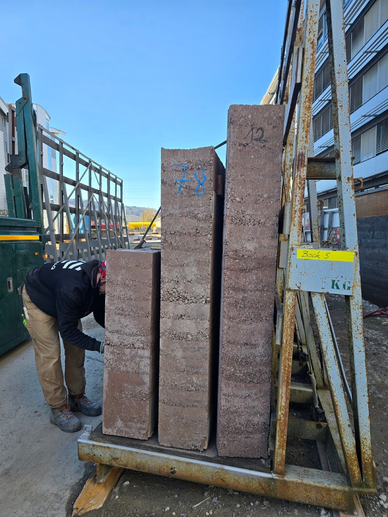 - Leistungen: Materialaufbereitung, Elementplanung, Herstellung und Montage der mit Trasskalk stabilisierten Stampflehm-Elemente beim Sockelbau durch Keller Systeme AG mit LEHMAG AG
